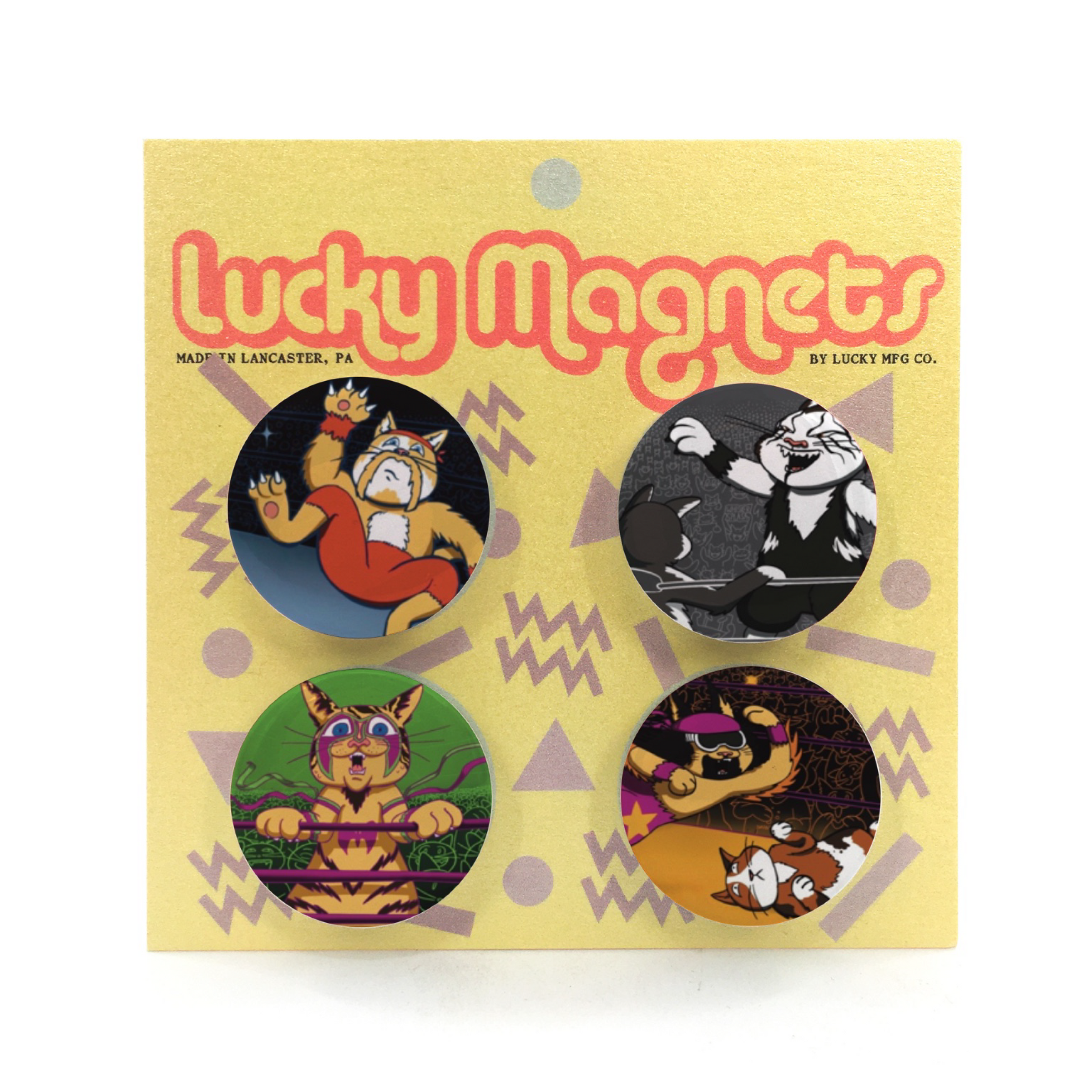 4 round "button" magnets featuring designs of Famous Pro Wrestlers as cats.